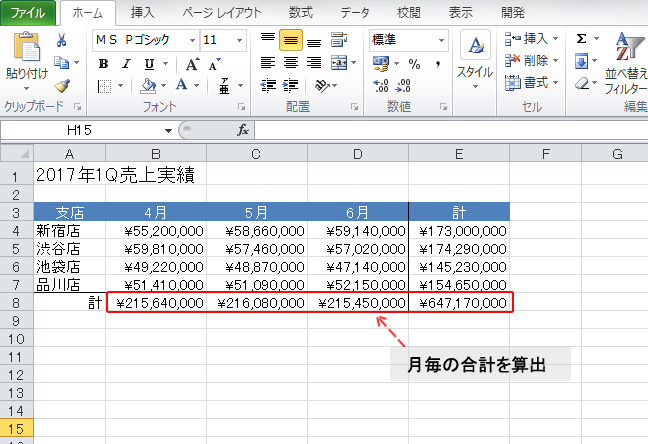 例えば図1のように、4店舗、3カ月分の売上データが入力された表があるとする。E列には店舗毎の合計、8行目には月ごとの合計をそれぞれSUM関数で算出している。