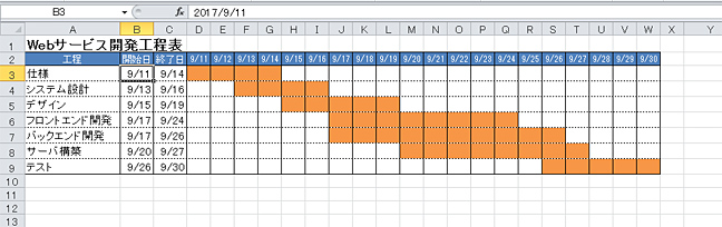 ガントチャートはプロジェクト管理などにおいて、各工程のスケジュールを横棒など視覚的に表現した表である。今回は各工程のスケジュールをセルの塗りつぶしで表すタイプのガントチャートを作成したいとする。