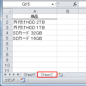 例を挙げて解説しよう。今回は以下のように、4つの選択肢をワークシート「Sheet2」のA2~A5セルに用意したとする。先頭行のA1セルは見出しとして、「商品」を入力したとする。
