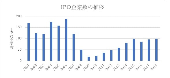 2000年代初頭には100社を超えていたIPO企業数は、リーマンショックにより2007年~2009年にかけて大幅に落ち込みました。