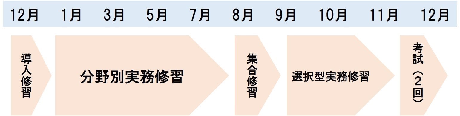 導入研修後に実務研修と集合研修があり、最後に通称「二回試験」があります。