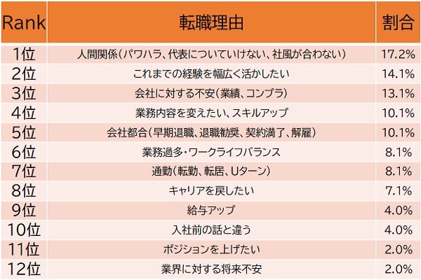 2位は「経験を幅広く活かしたい」といったポジティブな理由、3位は業績悪化などによる「会社に対する不安」でした。では、詳細をみていきましょう。
