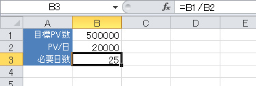 例えば図1のように、自社WebサイトにおけるPV数の目標結果があるとする。B1セルには目標PV数、B2セルに1日あたりの平均PV数(以下、「PV/日」)を入力し、B3セルには目標達成に必要な日数を求める数式「=B1/B2」を入力している