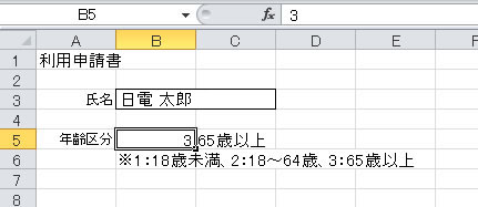 まずはCHOOSE関数の基本的な使い方を解説する。例えば図1のような利用申請書があり、B5セルに1~3の番号を入力して、下記の該当する年齢区分をC5セルに表示したいとする。
