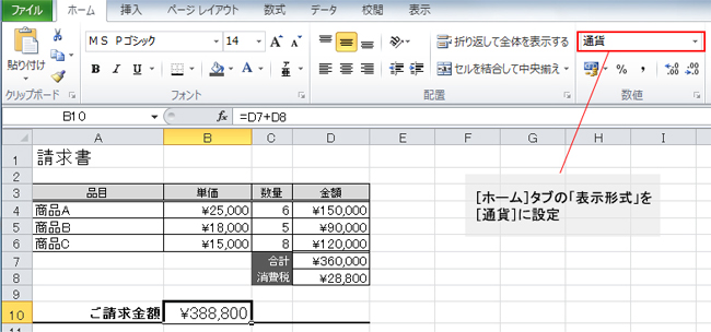 金額のセルに表示する数値に、日本円の通貨記号である\マークを付けるには、通常は「表示形式」機能を利用する。例えば図1のような請求書で、請求金額をB10セルに表示したいとする。その場合はB10セルを選択し、[ホーム]タブの「表示形式」を[通貨]に設定すればよい。その他の金額のセルもすべて「表示形式」を[通貨]に設定してある。