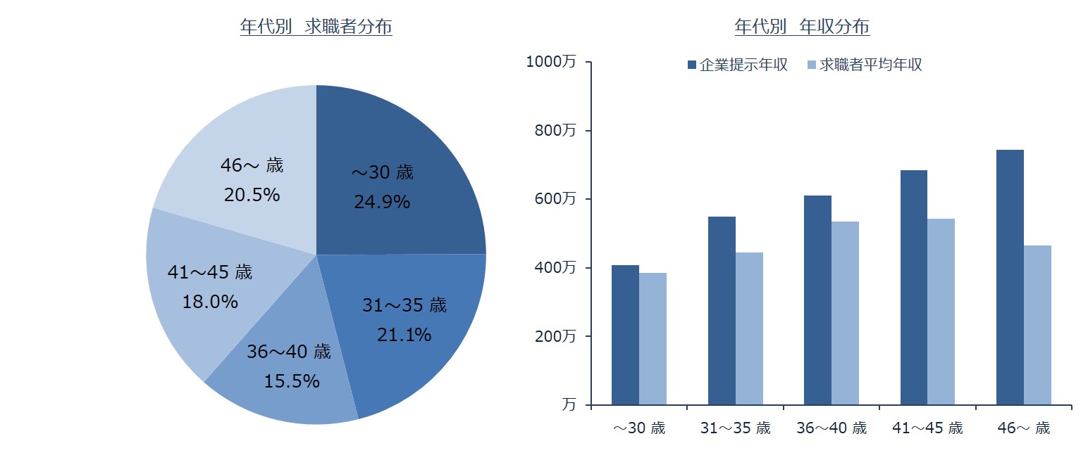 会計事務所の30歳以下の求職者割合は、2019年4月~6月と比較すると22.5%⇒24.9%と増加しました。税理士試験受験者などが増えたためと思われます。一方で30歳~45歳の求職者は減少、45歳以上の求職者は18.8%⇒20.5%と増加しています。