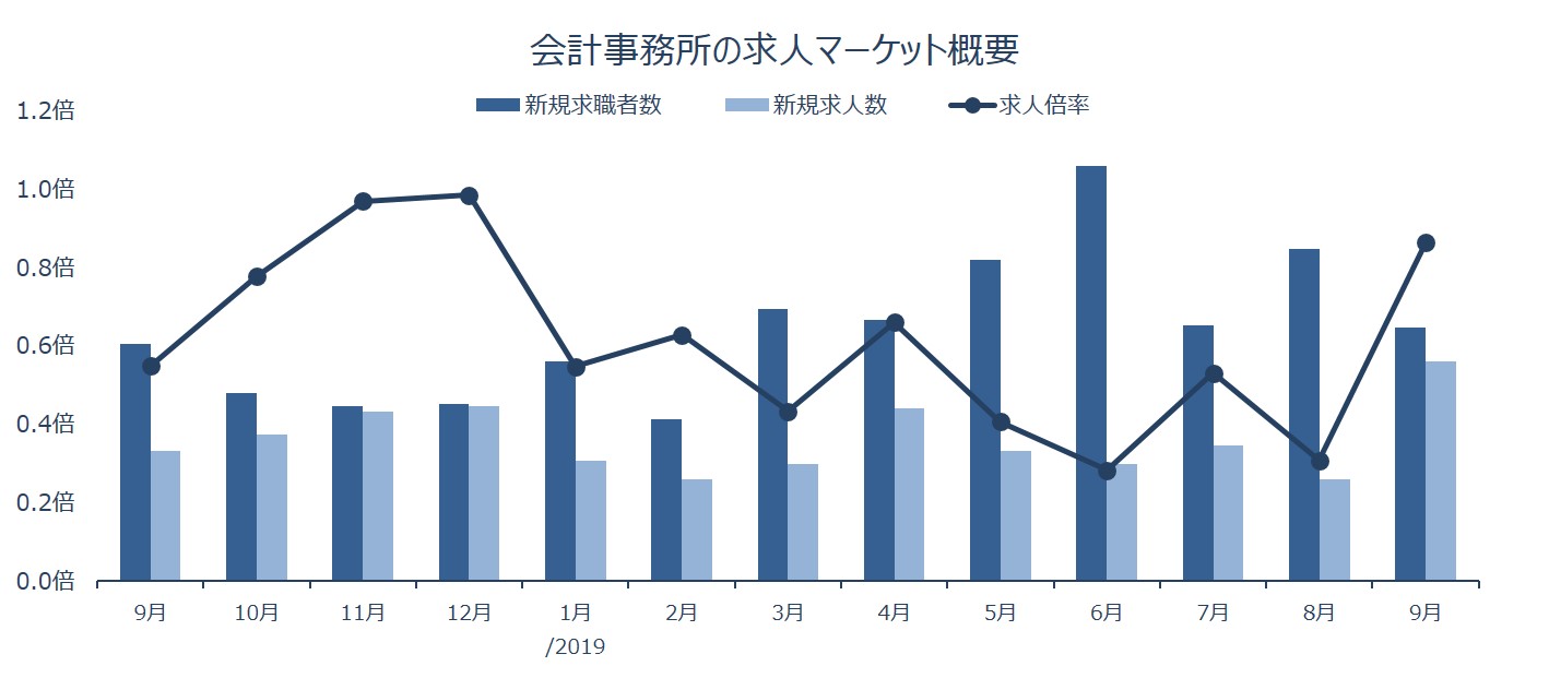 会計事務所は、5月~8月の求職者増加の時期に採用が出来たかがカギとなります。一方で、今年度引き続き採用をしたい場合もあるかと思います。例年、年末にかけて会計事務所の求職者数は減少しますが、繁忙期前に採用を検討する企業が増えますので、求人倍率は12月をピークに急上昇する予定です。そんな厳しい採用市場の中で、採用を成功させるためには、未経験者も含めた若手や、50代以上のベテラン層も視野に入れると良いでしょう。