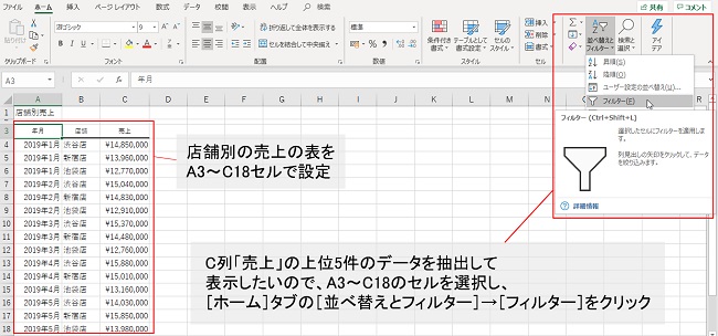 例えば、図1のような店舗別の売上の表がA3~C18セルにあり、C列「売上」の上位5件のデータを抽出して表示したいとする。その手順は次の通りだ。まずはフィルターをオンにするため、目的の表内の任意のセルを選択し、[ホーム]タブの[並べ替えとフィルター]→[フィルター]をクリックする。