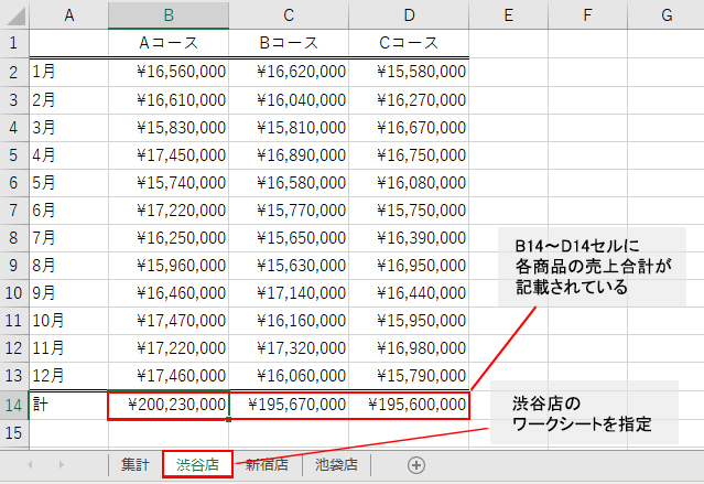 例えば図1~3のように、3種類の商品の売上データが渋谷店と新宿店と池袋店それぞれ別シートに入力され、各商品の売上合計がB14~D14セルに求めてあるとする。ワークシート名は店舗名とする。