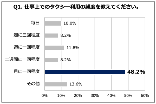 最初の質問「仕事上でのタクシー利用の頻度を教えてください」(n=110)では、「月に一回程度」が48.2%と最多の結果に。一方で、毎日利用している人も10.0%いることが判明した。