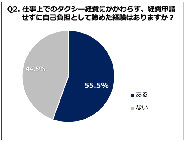 2問目の「仕事上でのタクシー経費にかかわらず、経費申請せずに自己負担として諦めた経験はありますか?」(n=110)という問いには、前述のとおり55.5%の人が「ある」と回答。多くの人が、自分の懐を痛める経験をしていた。