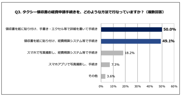 そんな悲しい経験をしてしまう理由は、もしかしたら経費申請方法にあるのかもしれない。3問目「タクシー領収書の経費申請手続きを、どのような方法で行なっていますか?」(n=110、複数回答可)では、最多で50.0%の人が「領収書を紙に貼り付け、手書き・エクセル等で詳細を書いて手続き」と答えた。