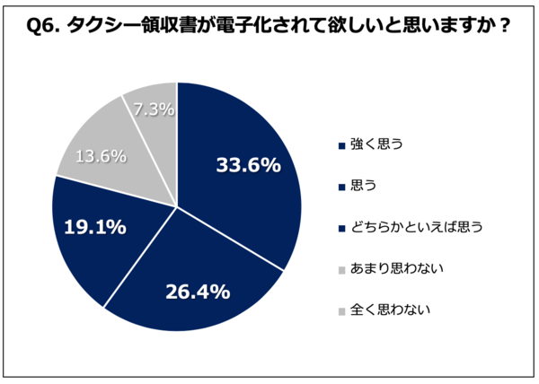 ペーパーロジック社は最後の質問で、「タクシー領収書が電子化されて欲しいと思いますか?」(n=110)と尋ねている。これには計79.1%の人が、「強く思う」「思う」「どちらかといえば思う」と回答した。