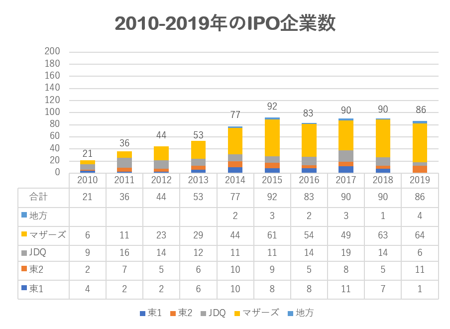 2019年は2018年に引き続きIPOが86件と、ここ数年とほぼ同水準ですが、過去10年平均である71.9件を上回った年でした。