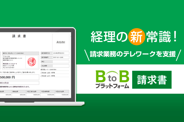 BtoBプラットフォーム 請求書は貴社と取引先との請求書のやり取り(発行・受取)を、電子データで行うWeb請求書クラウドシステムです。 “紙”の請求書の取り扱いが減ることで、請求業務の軽減とコスト削減につながるうえ、取引先とのやりとりも、社内の承認フローも電子データ化できるから、経理業務のテレワーク…