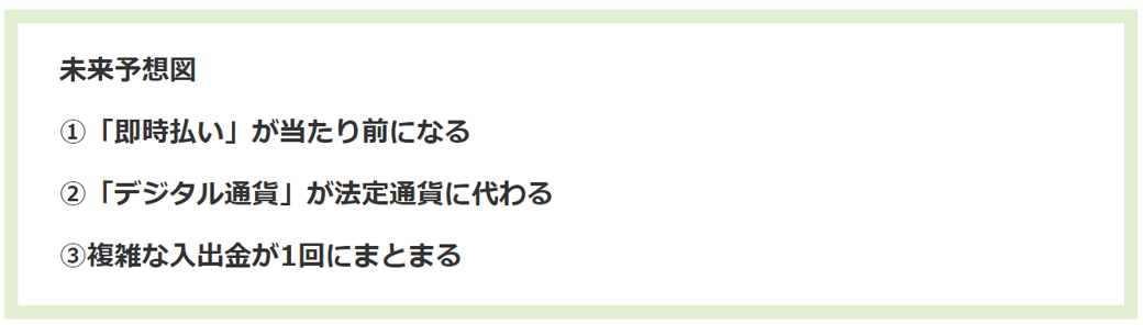 早く賃金を払うためには、顧客からの支払いも早めてもらう必要がある。結果として、BtoB決済でもリアルタイム性が高まると考えられている。