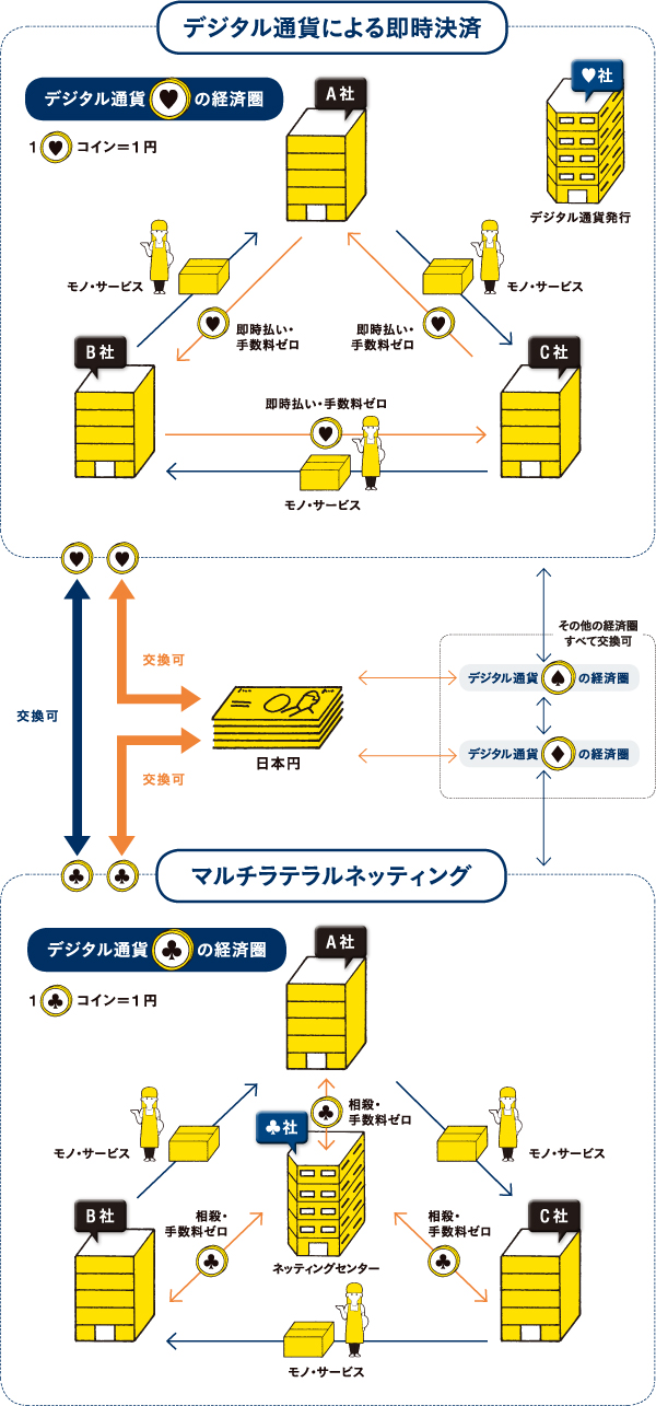 プラットフォームを利用する企業間での取引は独自のデジタル通貨で支払い、または受け取りを行って、円に換金することになる。プラットフォームが複数できて異なるデジタル通貨が流通しても、デジタル通貨同士も交換できれば問題はないという。