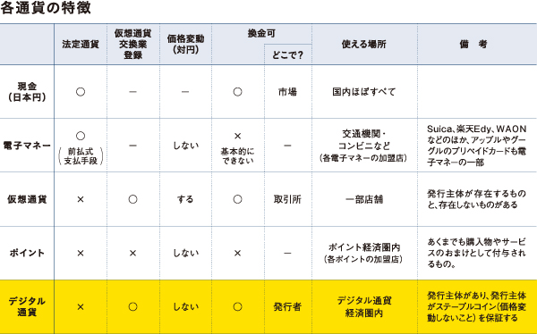 仮想通貨との大きな違いは、発行主体(日本円にとっての日本銀行のような通貨を発行する管理者)があり、円に対しての価値も変動せず、いつでも換金できる点だ。
