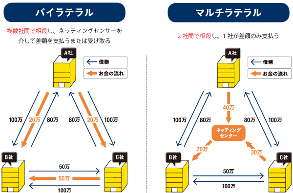 「ネッティング」とは、互いに売買取引のある2つの企業同士(バイラテラル)で、一定期間の支払いと受け取りを帳簿上で相殺し、差額だけを支払う方法だ。2社のうち債務が上回っている方が1回支払うことでやりとりを終わらせることができるので、振込の手間とコストが1回分で済む。