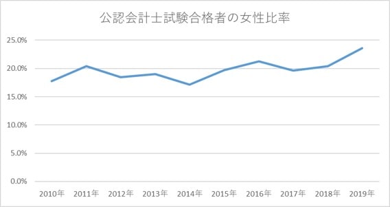 上の表とグラフを見ると、ここ10年で、公認会計士試験合格者の女性比率は増加傾向にあることがわかります。