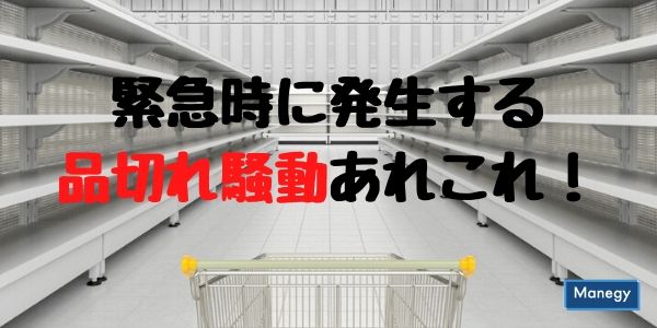 東日本大震災の時には、東京の店からペットボトルの水が消え、地震や台風の被害発生する度に、電池やブルーシート、ガムテープ、カセットコンロ、カップ麺などの非常食などが品薄状態となります。