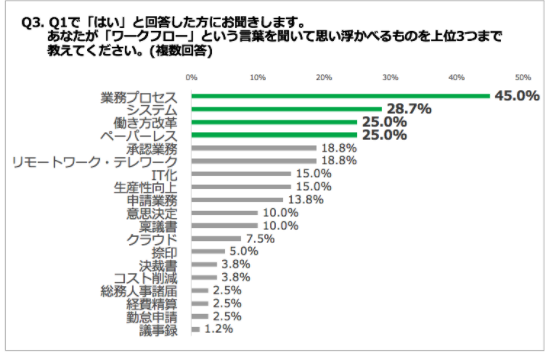 また、上記質問で「はい」と答えた人に「あなたがワークフローという言葉を聞いて思い浮かべるものを上位3つまで教えてください」(n=80)と尋ねたところ、「業務プロセス」と答えた人が45.0%で最多に。以下、「システム」(28.7%)、「働き方改革」(25.0%)、「ペーパーレス」(25.0%)と続いた。