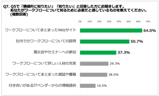 同じく上記質問の回答者に、「あなたがワークフローについて知るために必要だと感じているものを教えてください」(n=75)と質問したところ、最も多かった声が「ワークフローについてまとまったWebサイト」(64.0%)だった。