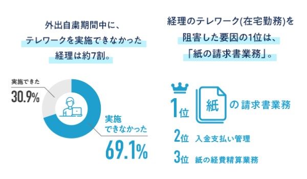 ロボットペイメント実施の「経理1000人に聞いた緊急事態宣言下における働き方と電子化推進に関するアンケート調査」によると、が外出自粛期間中にテレワークを実施できなかった経理は約7割、経理のテレワーク阻害要因1位は紙の請求書業務、という結果が出ている。