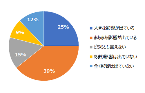 「大きな影響が出ている」は25%、「まあまあ影響が出ている」は39%で、これらを合計した「影響が出ている」(以下同じ)とする企業の割合は64%と6割を超えており、3月末に実施した前回調査(以下同じ)の58%から6ポイント上昇し、さらに深刻度が増していることが分かる(図表1-1)。