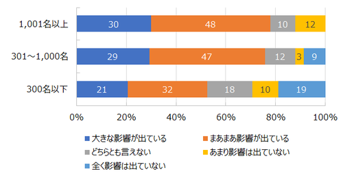 企業規模別に見ると、従業員数1,001名以上の大企業では「影響が出ている」が78%で、従業員数301~1,000名の中堅企業では「影響が出ている」が76%となっており、ともに8割近くの企業に、既に少なからず影響が出ていることが分かる。一方、従業員数300名以下の中小企業では「影響が出ている」が53%となっており、半数は超えているものの、大企業及び中堅企業と比較すると影響が出ている企業の割合が低い結果となっている(図表1-2)。