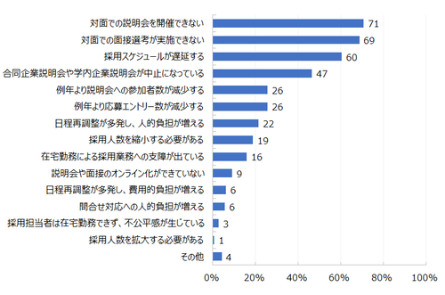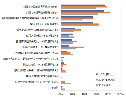 また、企業規模別に見ると、大企業では「対面での面接選考が実施できない」(74%)、「対面での説明会を開催できない」(72%)が上位を占め7割を超えており、これらの項目は、いずれの企業規模においても上位に挙がっている。また、中堅企業では「対面での説明会を開催できない」が82%で最多となるとともに、大企業及び中小企業より著しく割合が高いのが「例年より応募エントリーが減少する」(38%)と「例年より説明会への参加者数が減少する」(34%)であり、学生との接触の機会が失われたことによる焦りがうかがえる。