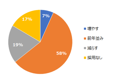 次に「2021年入社採用計画の2020年4月入社者数に対する増減」について聞いてみると、「前年並み」が58%と最多であり、次いで「減らす」が19%、「採用なし」が17%、「増やす」は7%にとどまっている。