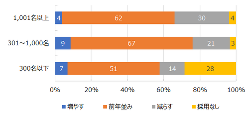 企業規模別に見ると、大企業と中堅企業では「前年並み以上」(「増やす」と「前年並み」の合計)が6割を超えているものの、大企業では「減らす」が30%、中堅企業では21%を占めている。また、中小企業では「採用なし」が28%と3割近くを占める状況となっている(図表3-2)。