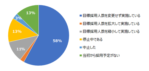 現在の採用活動については、本年度採用活動の「目標採用人数を変更せず実施している」が最も多く58%で、次いで「停止中」と「当初から採用予定がない」がともに13%、「縮小して実施している」が11%などとなっている。ちなみに、「縮小」「停止」「中止」を合計すると37%で、4割近くが当初の目標よりマイナスの方向修正を行っているこの状況は、新型コロナウイルスによる企業に与えるダメージの大きさを示している(図表4-1)。