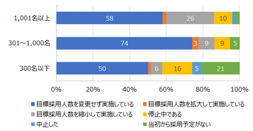 企業規模別に見ると、大企業では「変更せず実施」が58%で最多ではあるものの、「縮小して実施」が26%、「停止中」が10%、「中止」が2%となっており、これらを合計すると38%の企業において、何らかの形で採用活動にブレーキをかけざるを得ない状態に陥っていることが分かる。また、中堅企業においては74%が「変更せず実施」している一方で、中小企業では「停止中」が16%となっており、新卒採用活動への影響の深刻さがうかがえる(図表4-2)。