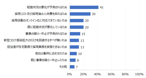 新卒採用活動を「縮小/停止/中止した理由」については、「経営状況の悪化が予測される」が41%で最多となっており、次いで「採用コスト及び採用後の人件費を抑える」が30%、「オンライン化に対応できていない」「既に経営状況が悪化している」がともに20%などとなっている(図表5-1)。