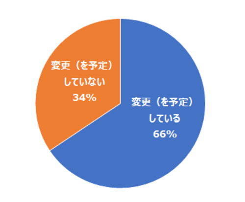 新卒採用活動を実施中、もしくは停止中の企業における「採用工程や手法の変更の有無」については、「変更(を予定)している」が66%、「変更(を予定)していない」が34%となっている(図表6-1)。