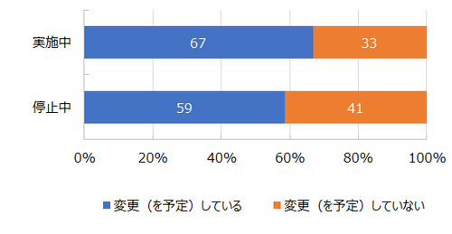 これを実施状況により比較すると、「(採用活動を)実施中」(「目標採用人数を変更せず実施」、「拡大して実施」、「縮小して実施」の合計)の企業では「変更している」が67%と7割近くで、「停止中」の企業では59%と6割であり、採用活動を継続している企業で、状況の変化により早く対応し持続可能な採用活動を実現している企業が多いことが読み取れる(図表6-2)。