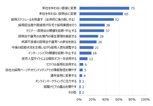 ●「来社を伴わない面接への変更」が7割以上、採用手法は「逆求人型」を重視