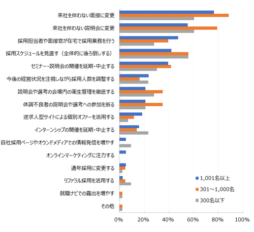 これを企業規模別に見ると、いずれの企業規模においても上位2項目は全体の傾向と同様で、大企業では「在宅で採用業務を行う」が47%となり、上位3項目はすべてオンライン化への対応に関連する変更となっている。また、中堅・中小企業では「採用スケジュールの見直し」も過半数であり、オンライン化に対応しながら社会情勢の動向を慎重に判断し、上手くバランスを取って採用活動を実施しようとしていることがうかがえる(図表7-2)。