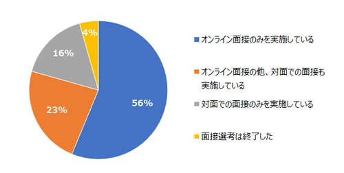 現在の「面接の実施状況」については、「オンライン面接のみを実施」が56%で過半数を占めており、次いで「オンライン面接の他、対面での面接も実施」が23%、「対面での面接のみを実施」が16%などとなっている(図表8-1)。