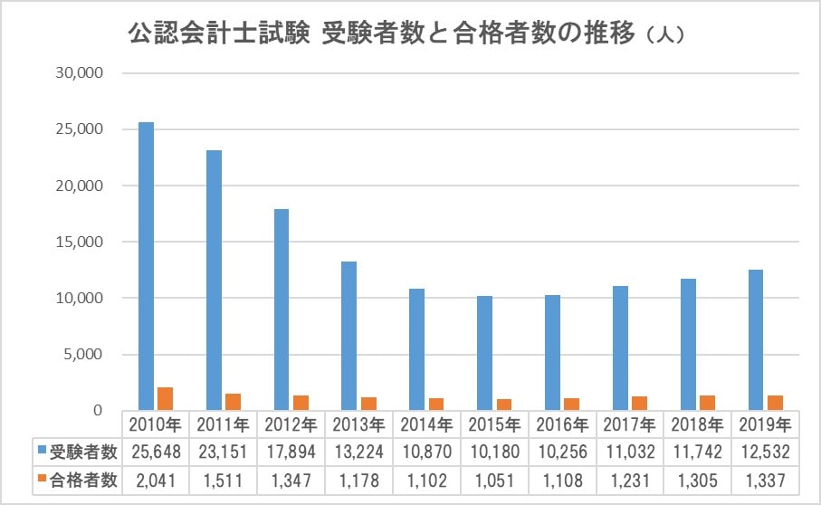 また、公認会計士試験の受験者数・合格者数も、一時は大きく減少していましたが、下のグラフのように近年ではふたたび増加に転じています。