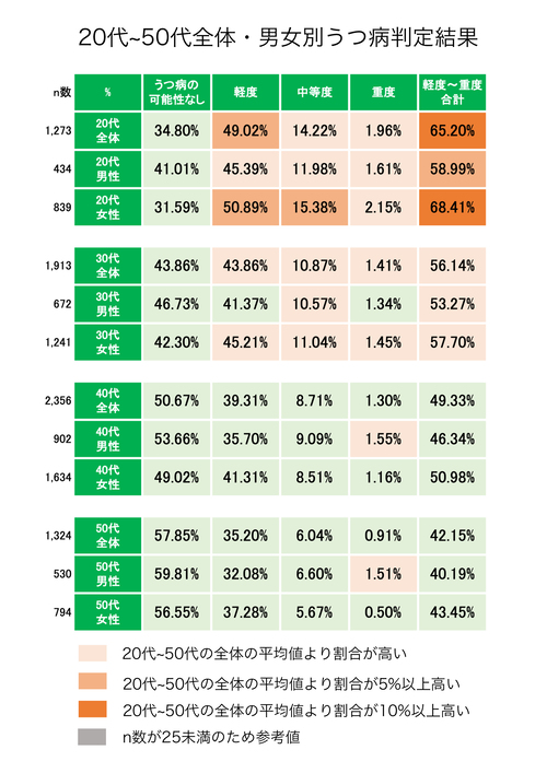 また、各年代の男女を比較すると、ほとんどの年代では男性より女性の方がうつ病の可能性ありの人の割合が高かった。さらに30代までの軽度~重度のうつ病の可能性と、40代~50代の軽度のうつ病の可能性では、女性の方が割合が高い。しかし、40代~50代の中等度・重度うつ病の可能性ありの人の割合は、男性の方が上回った。