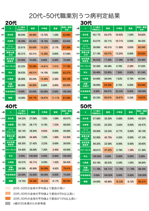 20代はどの職業も、うつ病の可能性がある人の割合(軽度~重度合計)が全年代の全体の割合の平均以上だった。一方、年代に限らず、軽度~重度のうつ病の可能性ありの人の割合が高かったのが、無職。平均を10%以上上回った。