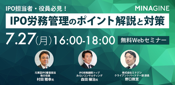 人事労務領域の総合サービスを提供する株式会社ミナジン(本社:大阪府大阪市、代表取締役社長:佐藤栄哲氏)は、IPO労務管理に関する無料オンラインセミナーを2020年7月27日(月)に開催する。本セミナーでは、企業のIPO準備責任者・担当者や役員に向けて、IPO労務管理のポイントや対策を解説してくれる。