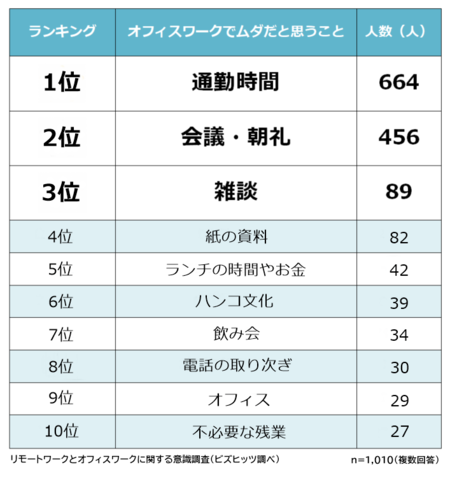 次に、「オフィスワークでムダだと思うことは何か」を聞いたところ、1位は「通勤時間」(664人)で、6割以上の人があげた。2位は「会議・朝礼」(456人)で全体の4割強、3位は「雑談」(89人)だった。
