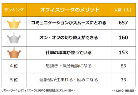 結果は、1位が「コミュニケーションがスムーズにとれること」(657人)。不明点をすぐに質問・相談してその場で解決できるため、「仕事がスムーズに進む」という意見が多かった。2位の「オン・オフの切り替えができる」は、通勤があることで気持ちが仕事モードに切り替わる、自宅には誘惑が多く集中しにくいという声があがった。3位の「仕事の環境が整っている」は、パソコン機器やネットワークの充実度など、仕事環境のよさが支持された。4位の「息抜き・気分転換になる」や、5位の「連帯感が生まれる・励みになる」も、1位同様、直接コミュニケーションをとれる点がメリットになっている。
