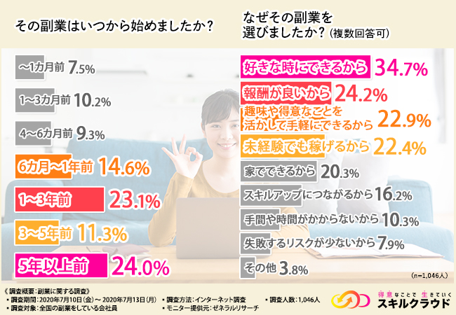 次に「その副業はいつから始めましたか?」という質問では、「5年以上前(24.0%)」が最も多く、以下「1~3年前(23.1%)」「6カ月~1年前(14.6%)」「3~5年前(11.3%)」と続いた。現在副業している人は比較的長期間働いている人が多く、その副業にメリットを感じているからこそ続いているようだ。