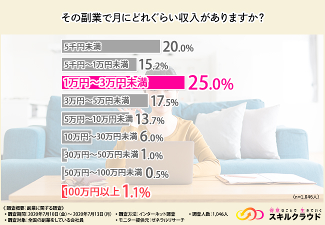 では、肝心の収入面はどうだろうか?「その副業で月にどれぐらい収入がありますか?」と聞いたところ、最も多かったのは「1万円~3万円未満(25.0%)」だった。2位は「5,000円未満」(20.0%)、3位は「3万円~5万円未満(17.5%)」。金額はそこまで大きくないが、生活費の足しや趣味の費用、定期的な貯金としては満足できる稼ぎなのではないだろうか。また、少数派ではあるが「100万円以上(1.1%)」というツワモノも!全体的には、「副業=小遣い程度の稼ぎ」というのが現実なようだ。
