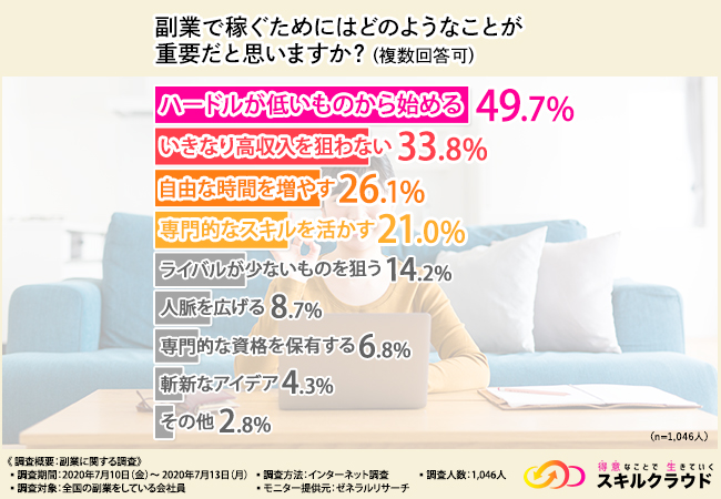 これから副業を始めたい人に、ぜひ見てもらいたい結果がこちら。「副業で稼ぐためにはどのようなことが重要だと思いますか?(複数回答可)」という質問では、「ハードルが低いものから始める(49.7%)」が最多で、以下「いきなり高収入を狙わない(33.8%)」「自由な時間を増やす(26.1%)」「専門的なスキルを活かす(21.0%)」となった。